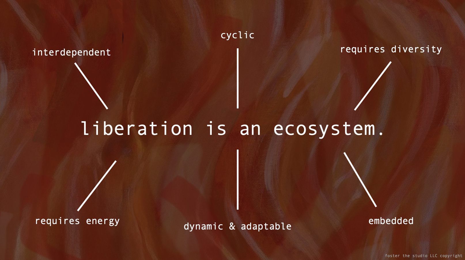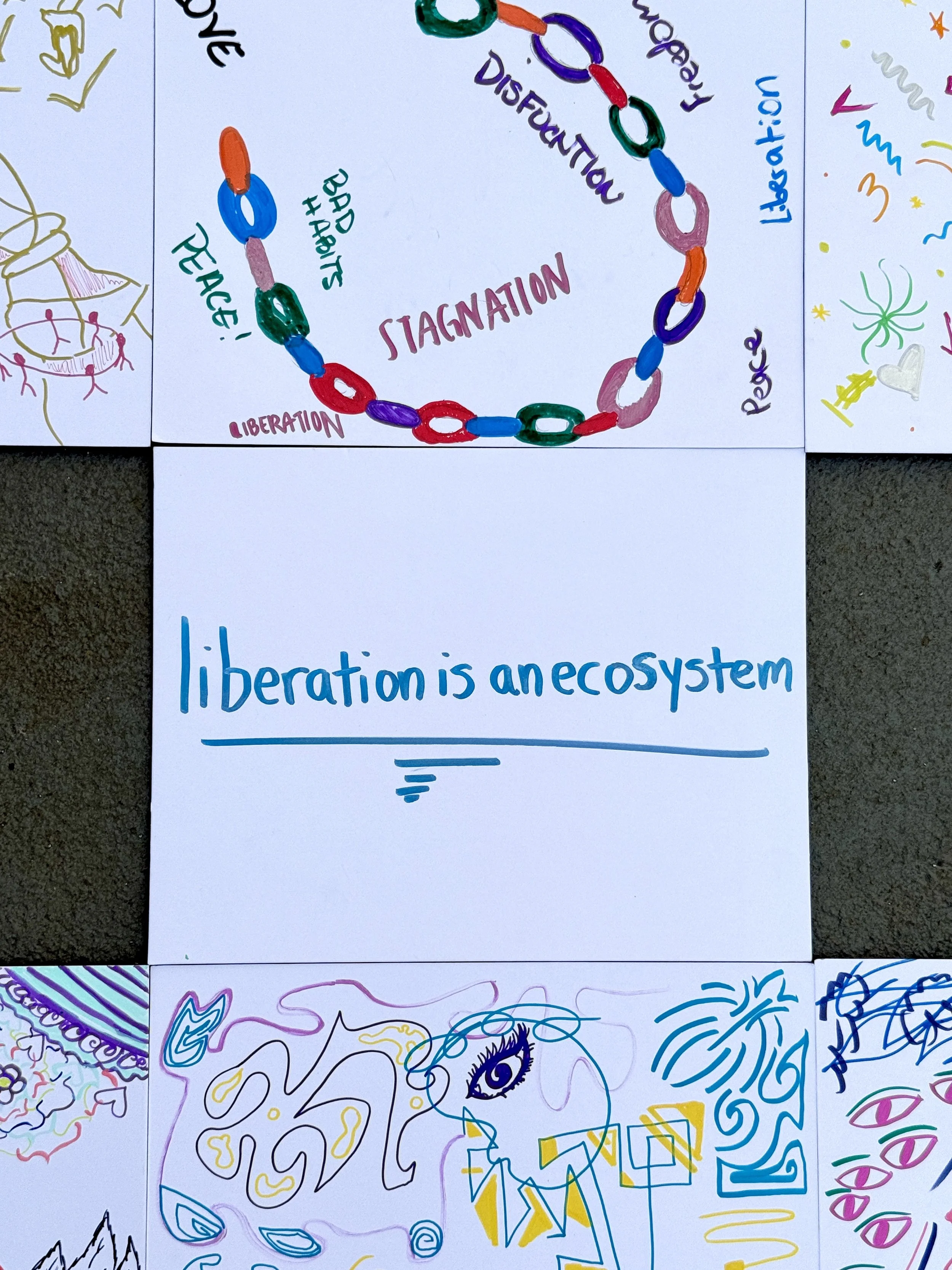 using six elements of a biological ecosystem — interdependence, energy, cyclic rhythms, adaptability, diversity, and place — i reframed each through the lens of liberation. we then revisited the artwork with this framework in mind.