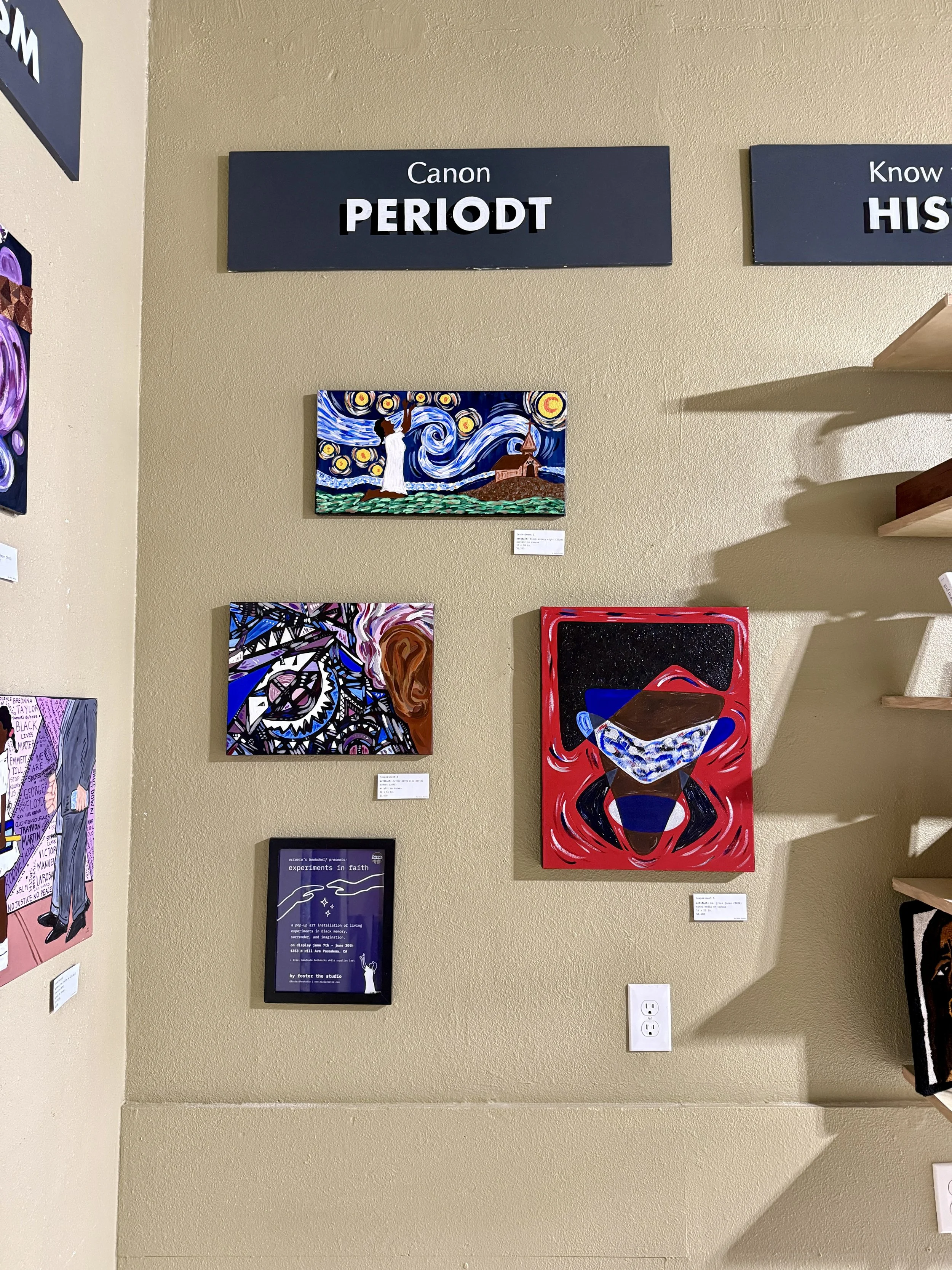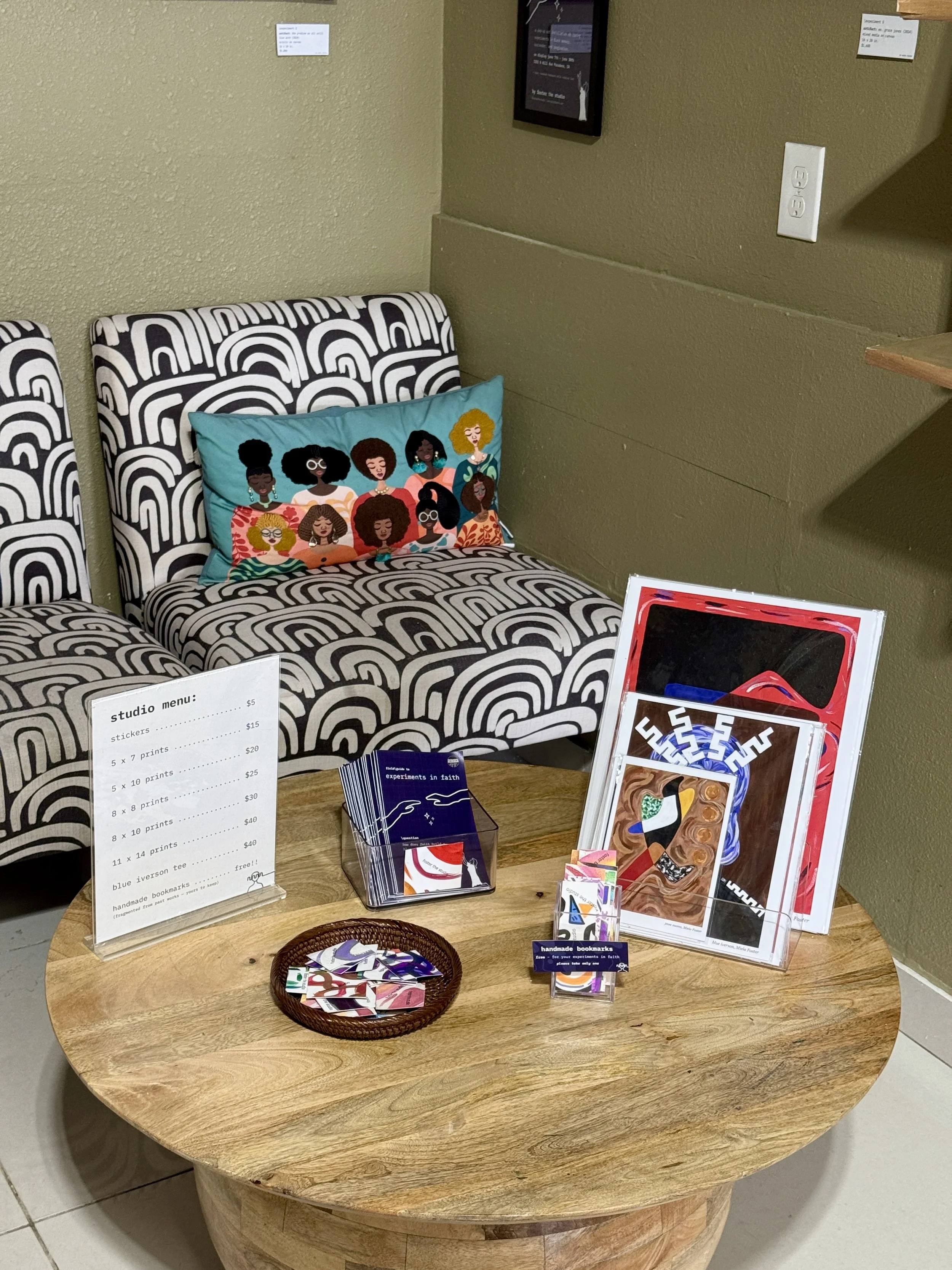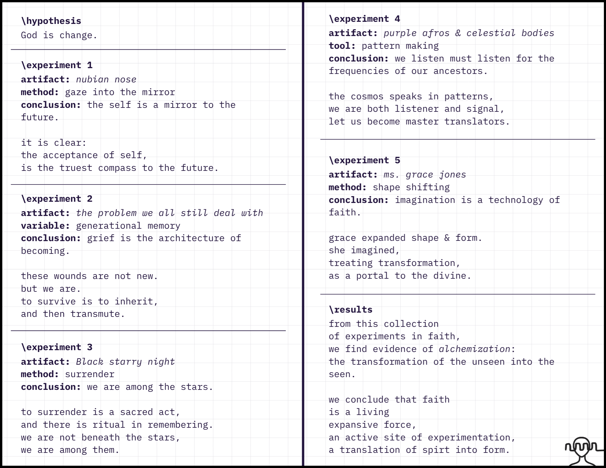 a living installation of experiments in Black memory, surrender, and imagination. each piece acts as its own inquiry into how faith is developed, remembered, and reimagined—through ancient, present, and futuristic lenses. the installation also offers participants handmade bookmarks, that are up-cycled from sketches.